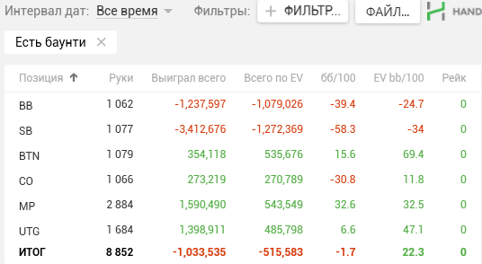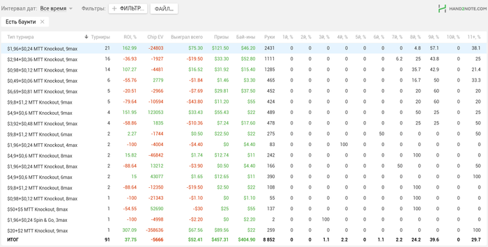 Итак по турнирам: играл шо попало , но в основном баунти: с учётом недобора и недоезда думаю, что в микролимитных мтт (килополя-баунти), можно иметь трехзначный рои