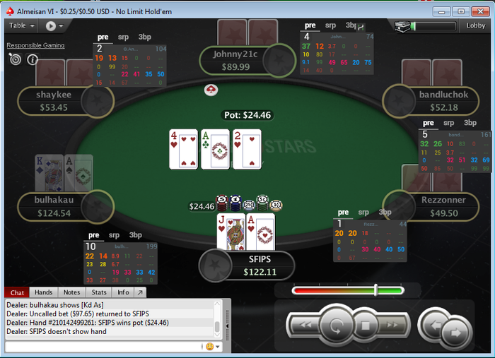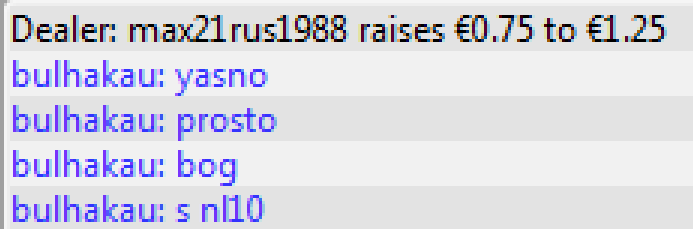 сидел играл спокойно и вдруг просто ЖАРА: рег пишет мне и тут же ему раздают АК через несколько минут на другом столе и снова АК: он фолдит и показывает я: но его попытались успокоить и тут мне раздали еще одну натсуху и наконец выиграв у обзывающегося игрока-любителя еще пару баинов я получил окончательный диагноз