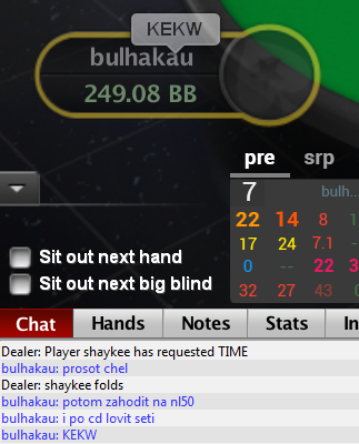 хад в зуме так и не заработал, в итоге играл шо попало и как попало валидольная раздача 4-бетишь в холодную K9s? Я ТЕБЯ ЗАПОМНИЛ!!! прокачиваем игру с ранних позиций не заходит с 53s ? ЗАЙДЁТ С 84s!!!