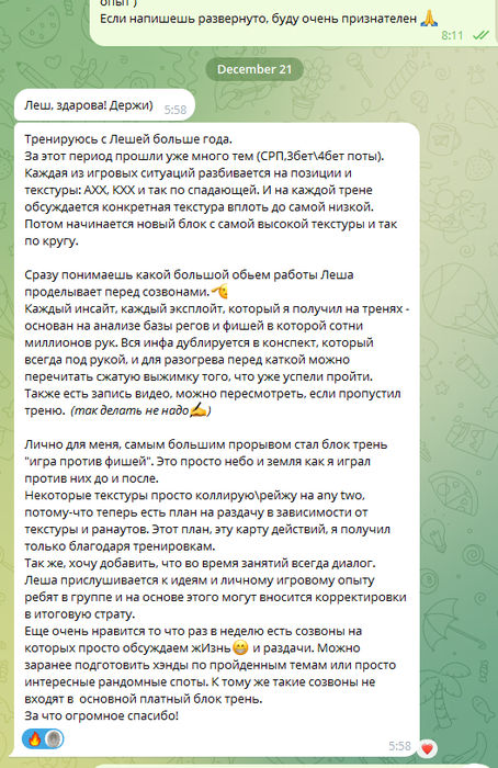 Если вы хотите прокачать свое покерное мышление и вывести его на более высокий уровень, то вам сюда! Тренировки проходят интересно, без воды, с примерами из многомиллионных ресерчей и солверов. Алексей находит такие интересные, а самое главное плюсовые линии, о которых я раньше даже и не задумывался.