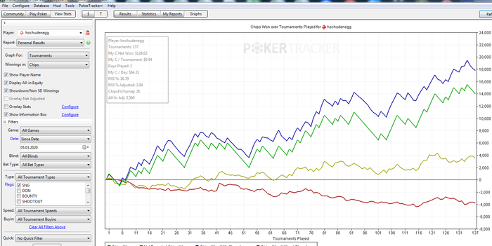 День6+7 вот сегодня столкнулся с регами играл в 2рега 4стола первое время и что я понял это то что надо регов изучать, придется писать что то на них чтобы преимущество, повторить материал против регов, гто изучать продолжать (давно не просматривал). Еще заметил что надо игру в коротких стеках как то улучшить немного. пока что это все мысли. тестируем дальше Немного тильт проявлялся с регами когда играл везде в 4 стола, казалось что мне чего то нехватает, информации.
