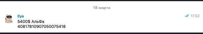 Сейчас получается происходит следующее. Билли говорит о том что весь дальнейших диалог был исключительно в телеграм, с момента отправки мне своих реквизитов скрилла и реквизиты мои он видел только в телеграмме. Но по условиям он точно понимал что нужны альфа usd на usd счет.