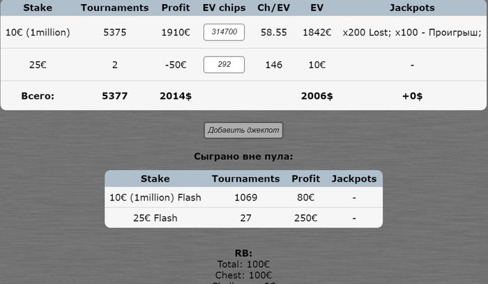 Поздравляю! Пиши в личку куда скинуть деньги, у меня есть ПС и $ скрилл. Я последние 3 дня сильно залил, в целом последние 9 дней отыграл в ноль. Разобрал игру, минимальные ошибки, не критические, как говорится бывает... В итоге вышло около +900, хуже результат наверное и не придумать (((