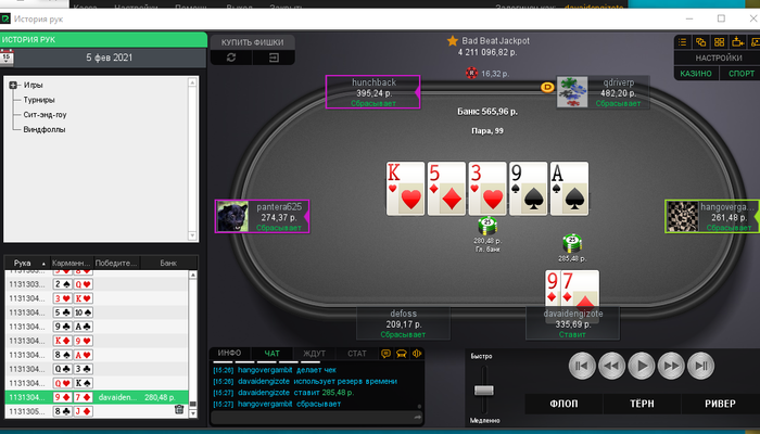 BombaZota13 @ 5.2.2021 Hangovergambit, пока что 1/2, вот смотри раздачка интресная против тебя )) Я конечно не фанат выставлять свои сыгранные руки, но из уважения к форумчанам джипси выложу , можете колить меня шире и чаще . CO мин рейз сб колл, bb сквиз, дефолт флоп, на терне у нас есть какое-то эквити, и на ривере в туза не мог не запихнуть, ведь там никогда не будет рук AX AQ и верххнего диапазона которые по дефолту трибетятся на CO, то есть диапазон оппа капнут ) А сейчас я продолжаю катать вечернюю сессию )
