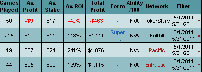 Январь кончился, значит пора подводить итоги. Долго ли коротко ли я гриндил, наиграл около 3k$ за месяц с учетом рейкбека и бонусов. Под конец месяца словил неприятный откат. Можно подвести кое-какой итог игре в раш-турниках. Если с 4$ все предельно просто, РОЙ 100% - это вполне реально, то с 11$ и с 24$ пока такого не получается, хотя фишей там предостаточно. Еще проблема заключается в том, что турники по 11$ и 24$ иногда очень плохо набираются, я пока так до конца не просек, с чем это связано. Играю я обычно ночью, бывает не собрать 4 стола. Ниже мои статы отдельно по лимитам.
