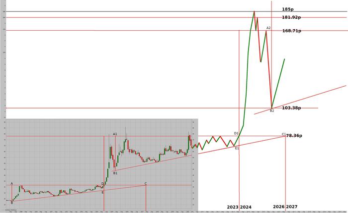 Точка D1 - 2023-24 гг - максимально возможная по отдаленности дата начала выхода из текущего треугольника и формирование новой фигуры. Какой, будет зависеть от состояния мировой и внутренней экономики, от событий, ее вызвавших. Но если ничего не изменится в экономическом укладе страны, то, скорее всего, очередного подобного треугольника А2В2С2.