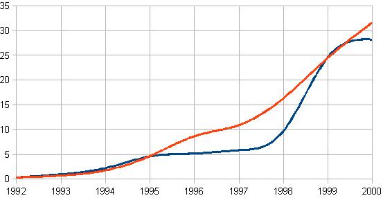 Можно обратить внимание на период 1992-1998 года, где происходила подобная ситуация дисбаланса и натягивания жопы на ананас, и чем это закончилось (синяя — официальный курс, красная — «реальный» курс на основе разницы ставок):
