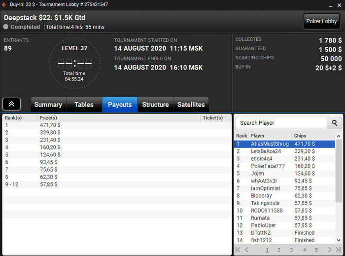 Отличная структура. Блайнды мгновенно не жрут стек. Раздавали, правда, очень хорошо, весь турнир. На финалке даже закалечил КК и JJ с 88 в тройном АИ с 10ВВ. В Топ-3 мог опять прикончить обоих в тройном АИ, но выкинул К6о, имея 40ВВ, когда у них было по 10ВВ, возможно, ошибочно, учитывая что соперники играли лучше, стоило рискнуть. В ХУ давно не играл, потерял наигрыш. Хотя в мелких ХУ турнирах и СНГ неплохо получалось лет 5 назад. Засуетился. В итоге стеки в ХУ летали туда-сюда, хотя начал с двойным перевесом по фишкам. Проиграл несколько решающих АИ, выставившись снизу с 40% на победу. Так как я потек, соперник меня обыгрывал. Но повезло, и в конце поймал несколько случайных аутов на ривере. Но иногда ведь может и повезти? Жаль, что не в дорогом турнире.
