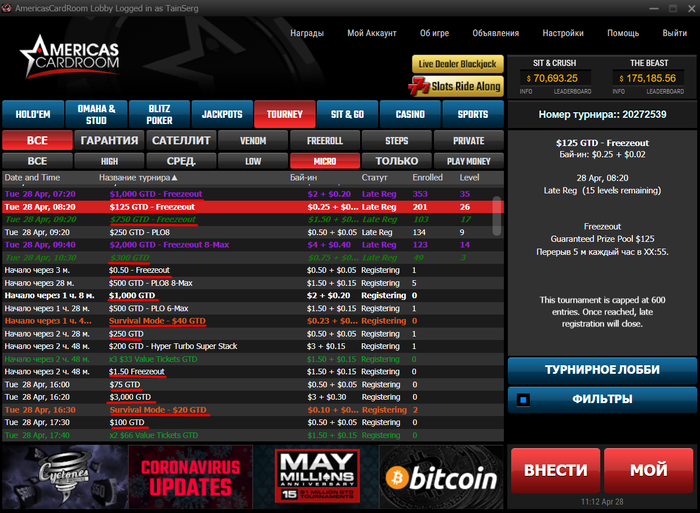 Рум заработал. Турниры все отменены. Вернули 2$ (чуть больше, чем за первые призы). Ужас. Высок шанс, что я попал на финалку (слабые оппы и топ 2 стек). Все жалуются, что ГСЧ забирает, а у меня забираем РУМ, с ГСЧ как раз всё более менее (переезжают и доезжаю одинаково).