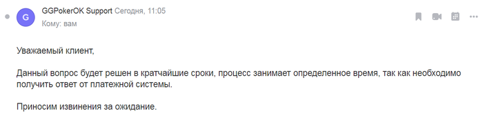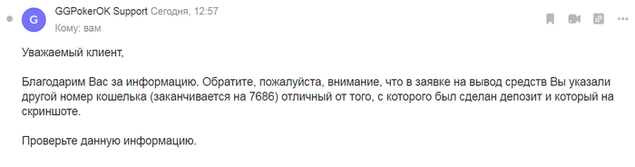 Я точно помню, как вводил номер. Я в принципе помню номера своих кошельков, но мало ли, что. Я специально открыл электронный чек с депозитом и скопировал номер кошелька в окошко формы заполнения. Всегда так делаю, в покер играю 10 лет уже, ни разу не вводил ошибочных номеров. Более того, есть привычка ещё и проверять то, что вбил. Ну дальше нажал ввод или что там и всё. Никаких проблем больше не было, как обычно стал ждать одобрения, ну и так далее.
