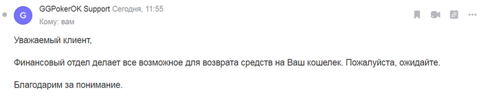 pokddl @ 9.5.2020 пришло почти сразу письмо. в котором говорится. что в кошельке вывода не совпадают четыре цифры с кошельком ввода