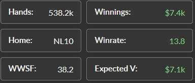 В целом месяц, хоть и противоречивый, но отнесу в актив. Зоны роста понятны и вполне себе прорабатываемы, ошибки были, но у кого их нет. Главное, что понятно, где именно ошибался (например, случай с трибетом с бб рейза и колла из ранней). Как говорят местные комрады "На лимите закрепился". Останусь на НЛ16, торопиться мне некуда. К тому же решил БРМ сделать чуть более консервативным, теперь 70 БИ на лимит. Попытка сдвинуть режим, чтобы катать по ночам (с 01:00 до 06:00) была отвергнута мозгом даже после настойчивых повторений, он просто отказывается работать в это время суток и чувствуется сонливость даже если перед этим спал 8-9 часов. Поэтому оставлю себе для практики только вечернее время.
