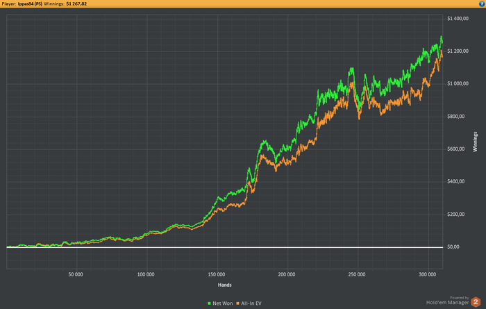 Небольшая ремарка о количестве часов, почему именно 300. Во-первых, это будет примерно 100.000 рук. Эта дистанция (по Вильямсу) более-менее говорит о качестве твоей игры. Соответственно, результаты этого отрезка будут объективнее, чем по итогам месяца, как раньше. Во-вторых, путем нехитрых манипуляций с Primedop.com получаю именно на этом количестве рук точку с 95%-й безубыточностью. То есть, я в конце такой дистанции, с вероятностью 95% увижу хоть какую-то плюсовость, а это норм для самочувствия и дальнейшего развития
