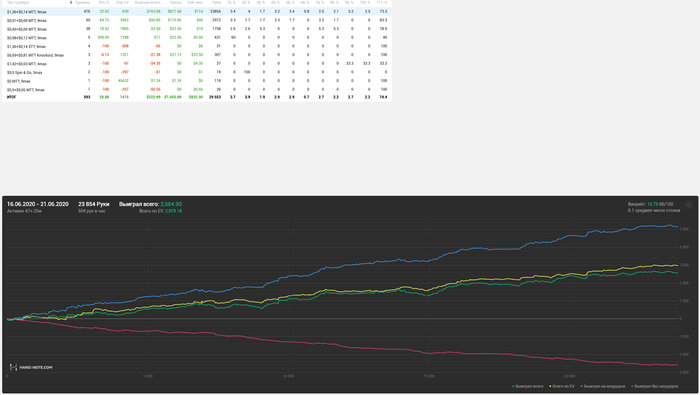Очередной недельный отчет. На этой недели играл в основном за 1.5$ на 45 и за 1$ на 90. В начале было страшно когда на первой сессии -40$ летел, а это средний профит с 4 сессий по 0.5$. Я уже себя материл ну нахера я такие дорогие подрубил, с такой слабой игрой как у меня туда рано пока лезть. Но потом получилось отбить в +. Игрой своей не доволен по большей части. Делаю много лишних колов, нету понимания как играть лучше в коротких стэках на поздних позициях, не давлю людей стэком итд. Но пока вроде везет. Надеюсь удача будет и дальше на моей стороне.