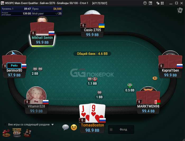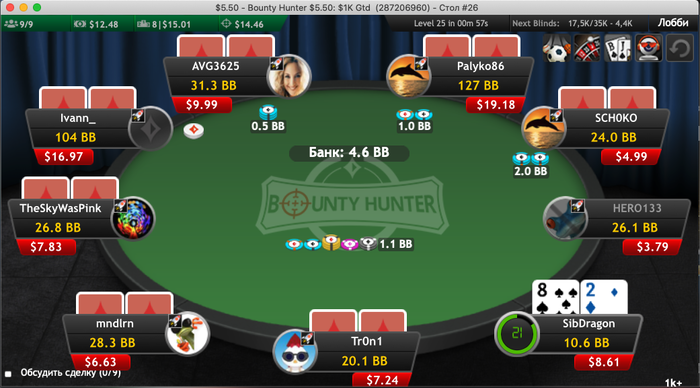 Далее, была цель войти в топ 4, но удалось в пару раздачах устоять, особенно против КК с QJ.