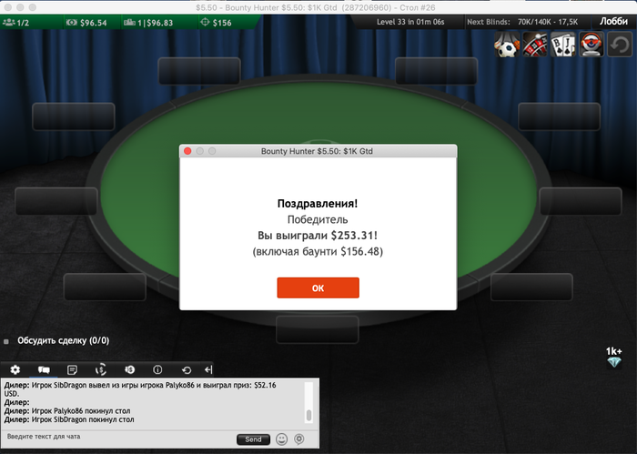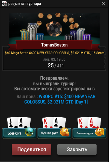 Конечно, очень рад победе, особенно в последнее время очень разачаровывался на GG, так как глубокие проходы были, но на финалку никак попасть не получалось. Но оказывается, иногда совершенно случайно, можно загрузить один турнир и играть в него 8 часов, а потом оформить финалку, одним словом - Сказка!