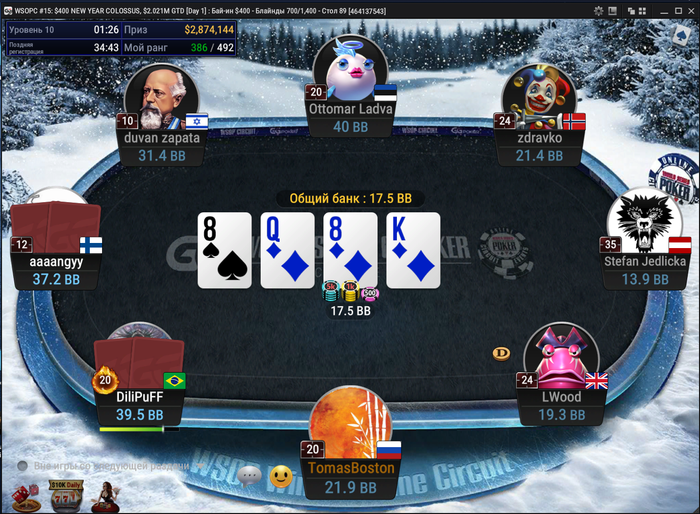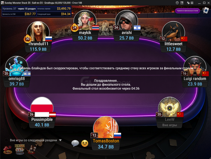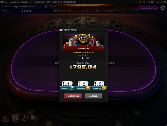 В субботу, 16 января мне стало сильно плохо, поднялась температура под 38,3 и пять дней я лежал с температурой. Вызывали врачей, пропил антибиотитки, сделал флюрографию, подтвердилась пневмания. Больше недели не грузил турниры, лечился, и вот вчера в понедельник решил загрузить один турнир на GG с названием "Sunday Monster Stack $5". Я знал, что там структура хорошая и плавная и можно спокойно играть в свое удовольствие. Цель была войти в топ 100, потом в топ 20, ну а на стадии двух столов цель стояла войти на финальный стол.