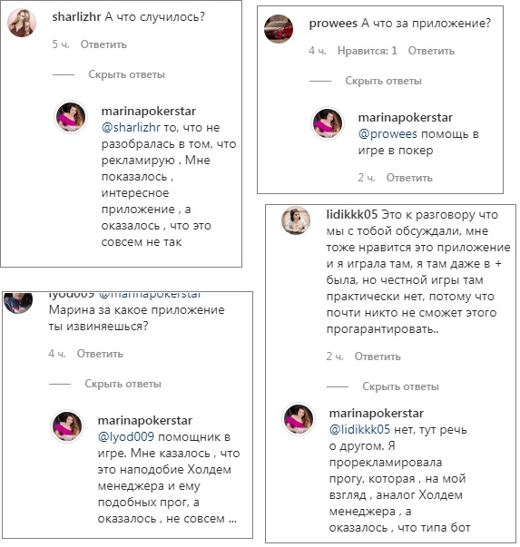 Подписался на ее инсту, когда она начала видеоуроки Школы Покера. Просто стало интересно, чему она может научить. Видео записывались на широкой кровати с шелковым бельем, Марина была одета в вечернее платье, либо сидела за роялем с бокалом шампанского. Отписаться сил уже нет, ибо контент доставляет.