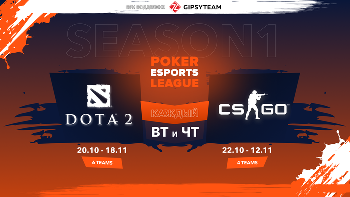 Мы рады представить вам первую киберспортивную лигу “POKER ESPORTS LEAGUE”, которая стартует 20 октября,среди покерных проектов стран СНГ. Покеристы будут соревноваться в двух дисциплинах - Dota 2 и CS:GO. Лучшие команды получат не только денежные призы, но и приятные подарки от GIPSYTEAM.