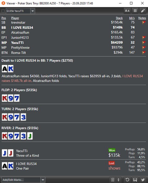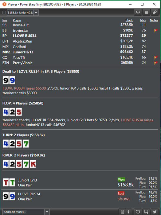 Professor76, Да не, дружище, все гораздо проще, просто я тильтанул в этой раздаче как ебанная макака) Сначала хотел ч/р флоп, но почему то нажал кол, когда на терне собрал натс, пригорел ПОЧЕМУ БЛЯТЬ Я НЕ Ч/Р ФЛОП??????)) Ну и ривер меня добил, очевидно что таким сайзом ривера у него только флеш и фэ=0, подумал раз я как кусок говна сыграл раздачу, то забирай братишка остатки)