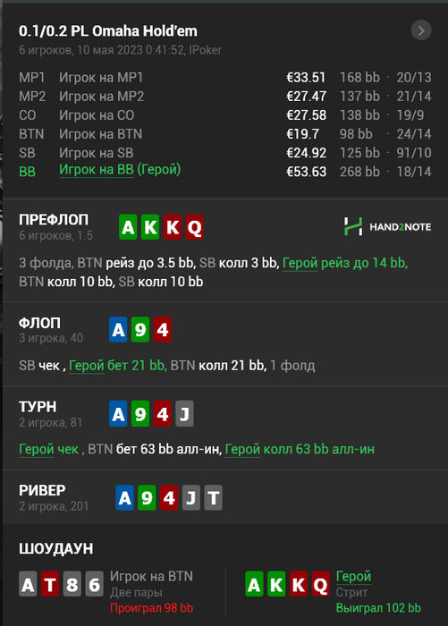 Завтра сделаю разбор раздач. Мне кажется много дарю и агрессии прибавить надо. Уверен есть много грубых ошибок которые режут винрейт. По ощущениям на этих лимитах 15ББ/100 вполне реально, составы огонь.