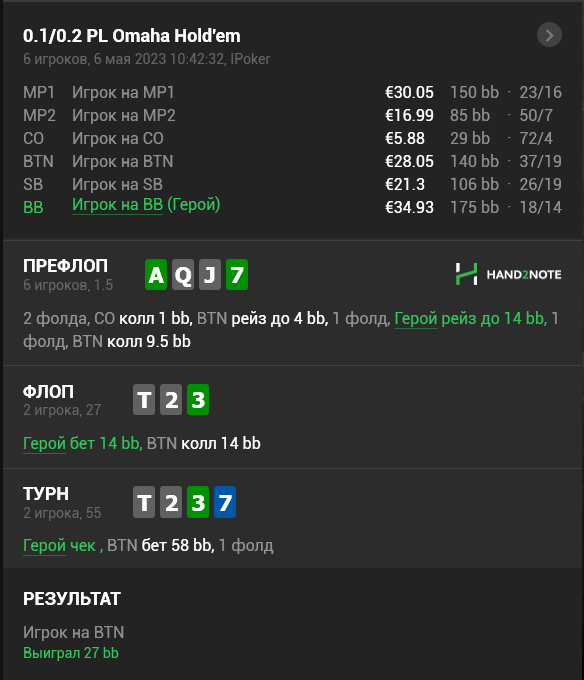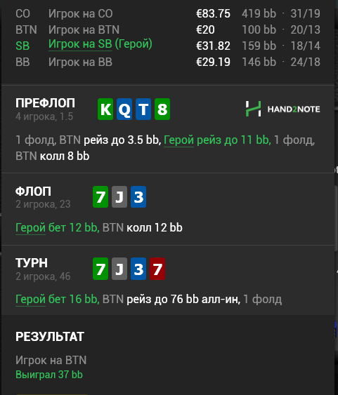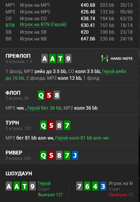 Здесь не уверен на счет сайзинга флопа, что думаете? Кажется что надо флоп играть бет пот, по терну доставлять