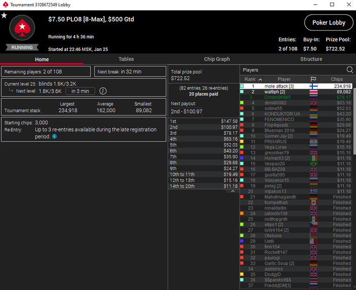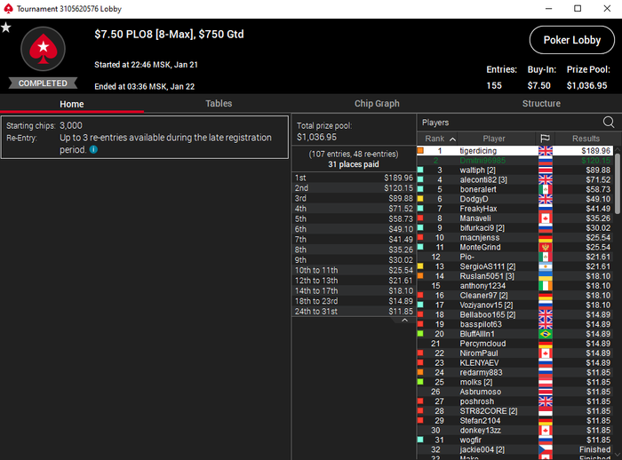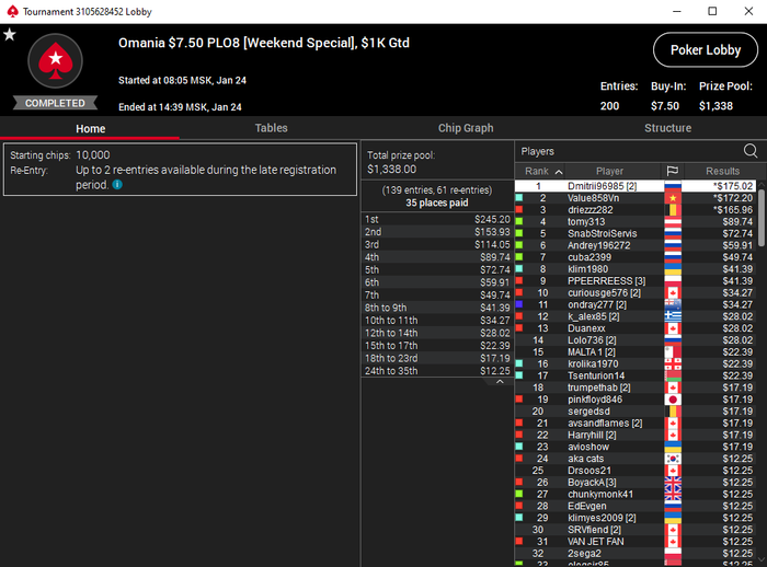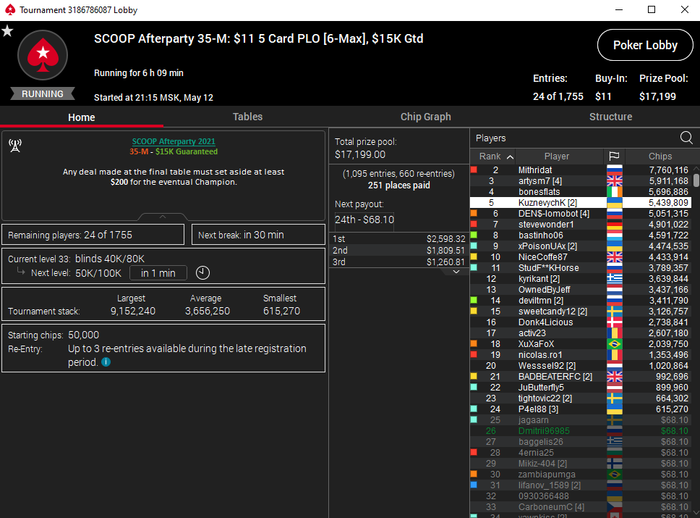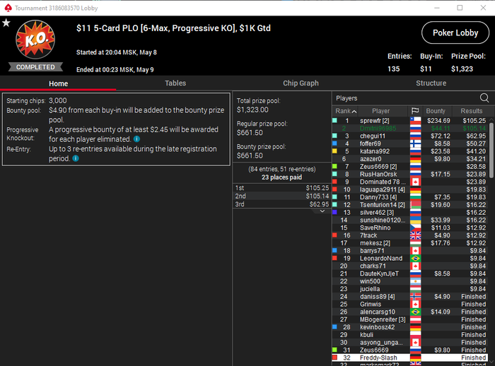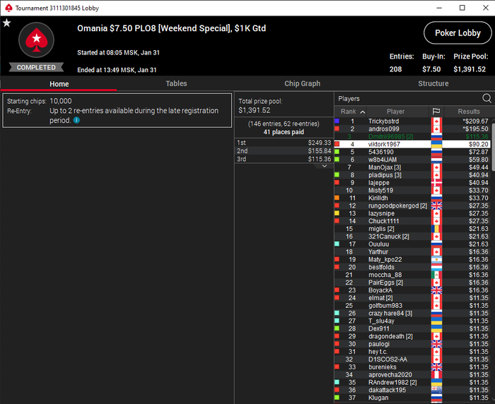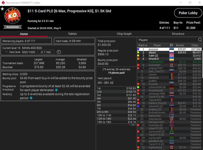 Хорошая сегодня прошла сессия по омахе 5 карт хай лоу. Во втором турнире занял 3-е место обидное