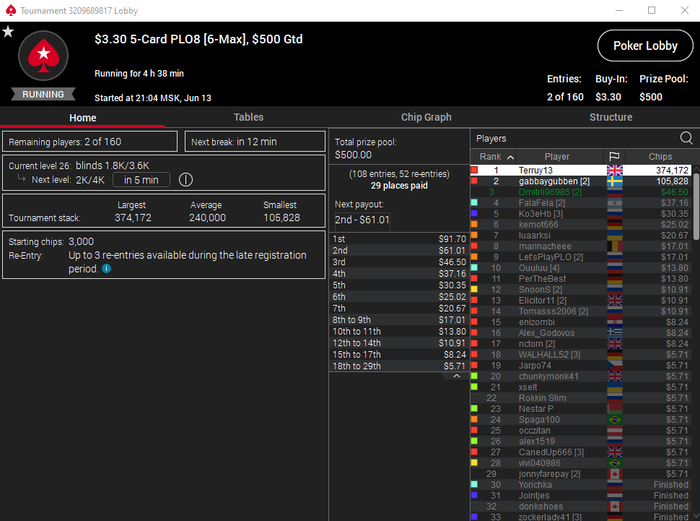 Доброй ночи!. Решил сегодня отыграть SCOOP 5 карт омаха хай. Достаточно неплохо шел в турнире. Прошел далеко, но немного все таки до финалки не хватило.Но результат все равно положительный, с учетой того, что в новой дисциплине только осваиваюсь.26 место в скором будущем надеюсь променять на топ 1.Всем удачи за столами