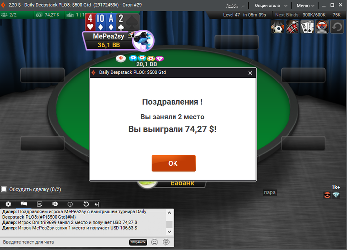 Видимо вчера это было не просто везение. Сегодня продолжил разрывать омаху хай 5 карт. Пришла первая победа!!! Сейчас в процессе еще 1 турнир.