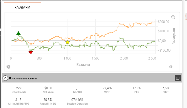 Отчасти, в этом и заключается количество отыгранных раздач. Т.е. в день я выделяю 4-6 баина которые либо проигрываю, либо удваиваю. Не совсем конечно, бывает и в ноль катаю или слабый плюс.. но в целом такая страта