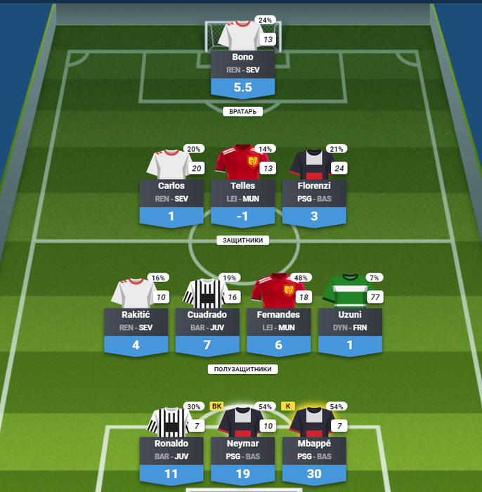 Долго думал между Роналду, Месси и Гризманом, выбрал опять же последнего из-за владения, возможно ошибся на дистанции, все-таки первые двое мотивированы. Лейпциг точно плюсово было даже капитанить, был уверен в них, МЮ тяжелый щас. Ну и резервисты Челси должны были доказывать, но не сложилось. В любом случае в моем составе только двое с уть больше 25% владения, вот что я называю составом на первое. Твой же состав намного чаще попадет в деньги, но разница в выплатах все компенсирует.