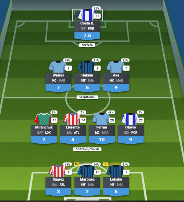 Угадал всю зашиту клиншитную + по чуйке взял Аке и он сделал голевую передачу. Угадал Феррана Торреса, который играл на острие и с большим желанием и брал пенальтиста Порту. Неудачи: Льоренте и Суарес(вместо Льоренте думал взять Карасско, которые сделал результативные действия в матч гол+ассист 13 фо). Миранчука брал под возможные пенальти+ценник очень дешевый. Ну и нападение Интера это facepalm. Лукаку с своим сейвом(дали бы ему +0,5). Не думал, что они пролетят вообще мимо весны. Еще ставку делал экспресс кэф примерно 25: Атлетико тб 1,5 Сити -1,5 Порту (0) и Интер -1,5...сами понимаете..как я зол на Интер.