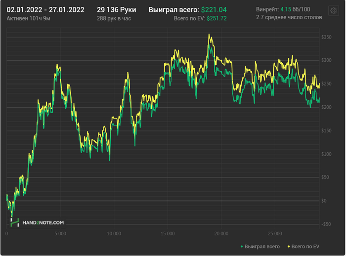 igor020792 @ 14.01.22Пару дней как начал нормально заниматься теорией, при этом перестал практически совсем играть.. не знаю хорошо это или плохо. Все - же поставленная цель по кол-ву рук не выполняется, но радует что теория начала работать. Но в целом думаю это не так плохо. Поиграть всегда успею.