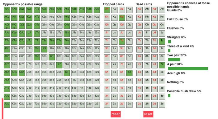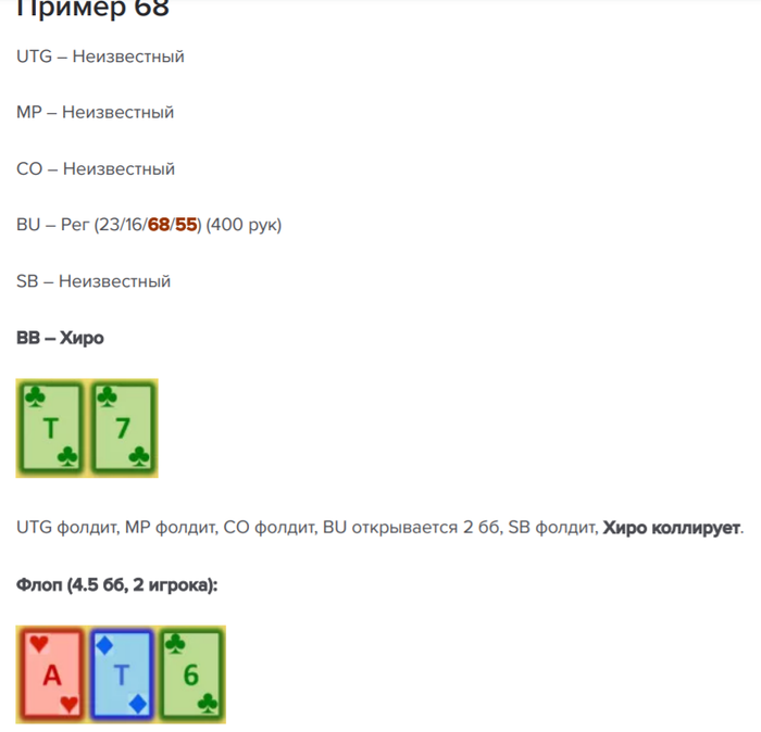 Я вообще в этом тоже новичок, но хочу тоже порассуждать. Мб я буду ошибаться в каждом слове, но надеюсь укажут на ошибки, поэтому тем лучше) Рендж оппа пускай 55% если я правильно понял статы из книги. После флопа мы видим, что у оппа пара в 48% случаев, просто туз хай в 51%