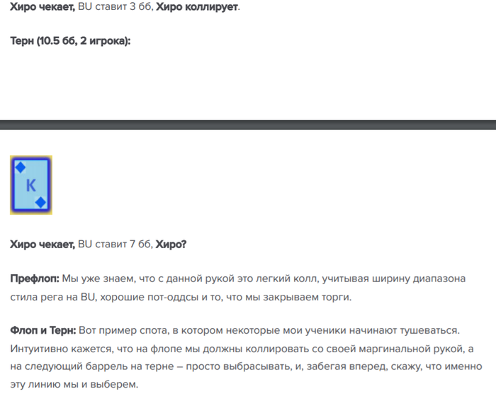В пояснении по эквити я не понимаю, что значит "рука, получившая пару с королем не баррелила бы терн с ШДВ". В том то и дело!!! Короля скорее всего нет. Там или попытка изобразить туза или туз, но если мы считали, что его нет на флопе (а дпиапазон баттона широкий и там много чего кроме тузов) то почему он вдруг появился на терне? Потому что в нас поставили 2ой баррель? Так многие блефуют 2мя баррелями... Возможно я не прав в своих рассуждениях - помогите разобраться!