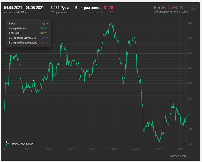 В х2н творится какое-то безумие, он скипает некоторые крупные банки на блитц столах PK и все бомб-поты. Вот так, по его мнению выглядит график с начала марафона, при том, что у меня не бывает меньше 3 столов, по факту я играю 3-6 и уж точно потратил на это не 28,5ч.