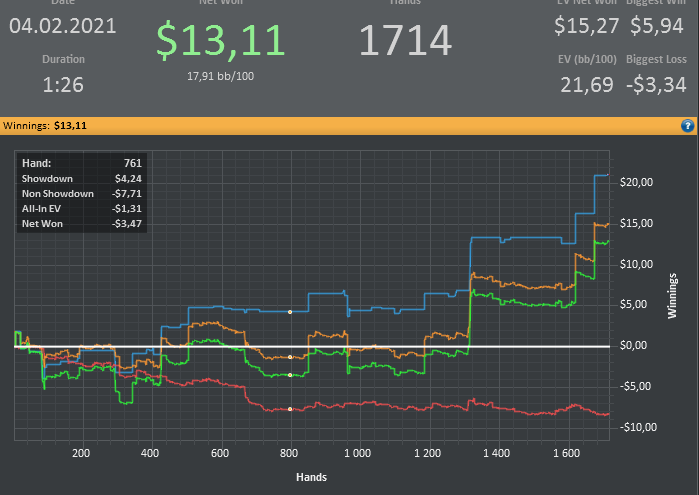 После которой у меня уже полностью опустились руки и я понял, что в зуме мне в данный момент ничего не светит. Первый раз было такое, что решил отмазываться выше и как законно потерпел неудачу. И профессионально намотался на свой самый большой минусовой банк ) тру стори. После поплакал минут 10, крича "что за несправедливость". Сделал выводы и просто наконец смог написать письмо в сб пс на блок зума. И так началась новая глава моей жизни. Стало так легче на душе и моментально появилась уверенность в следующем дне. Так, что если кто-то прочитает мой пост и он реально хочешь добиться каких результатов. То главная заповедь не запускай зум, не стоит его играть на начальном этапе с неокрепшей психикой и мало построенной игрой. И главной конечно ошибкой было прыгать с рег столов на зум столы до бесконечности. Надо было концентрироваться на одном. И уже в нем развиваться и мне многие говорили, что этого не стоит. Но это мой путь. Сильно ли я сожалею о потраченных 6 месяцах ? Нет. Я только рад, что у меня был такой опыт. И то, что я не сдался в течении этих 6 месяцев, пытался, верил, да не получилось. Главное сделать выводы и они были сделаны. Я всему благодарен. Могу точно сказать в том моменте я все равно был счастлив. Всегда пытаюсь преодолевать трудности с улыбкой на лице и вам того же желаю. Так как имея две ноги, две руки и голову которая может соображать, можно все преодолеть и многого добиться!) Внизу так же прикреплю резалты моей игры в зуме. Итог : за 420к рук - 0.80 бб на 100 ) Но это еще не конец)