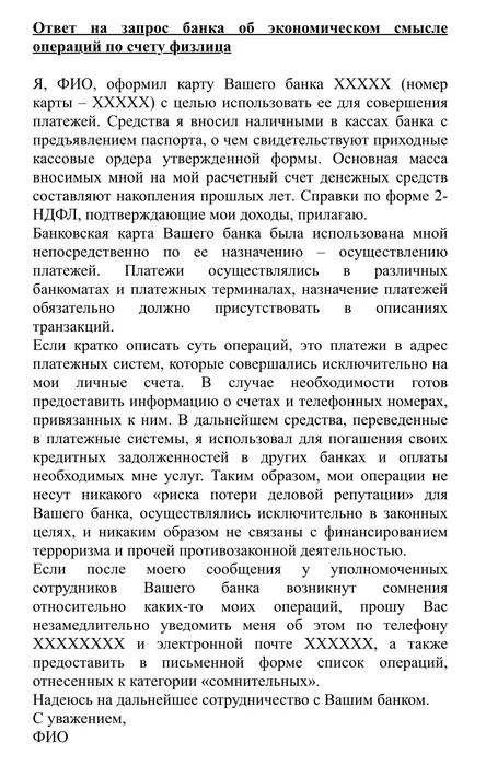 Ответ на запрос банка об экономическом смысле операций по счету физлица