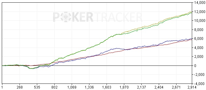 Провел небольшую работу над ошибками, нашел убыток в $1280 с пограничными руками, если бы выбросил префлоп, ничего не вкладывая, то график был бы таким