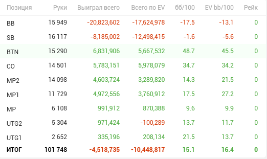 Всем привет!Давненько ничего не постил,много времени занимает гринд, а в свободные от работы время, хочется просто отдохнуть от покера, провести время с девушкой итд. В конце апреля ,после разбора базы, было выявлено очень много ошибок в крупных банках, поэтому пока не исправлю их было принято решения катать АБИ 4, но сейчас держу в районе 4,4-4,9. В скором времени предстоит уход в рейс,сроком на 6 месяцев,скорее всего в середине-конце июня.