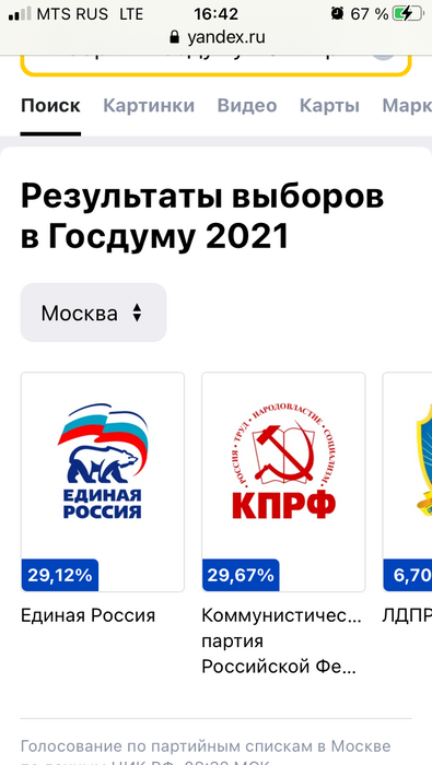 Кпрф лидировало в пол процента, чему я оказался очень рад, но то что произошло дальше меня мягко говоря шокировало. А если честно то я очень сильно разозлился. Идя с работы я снова чекнул выборы в Москве и когда я увидел что меня показал яндекс