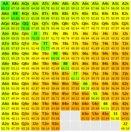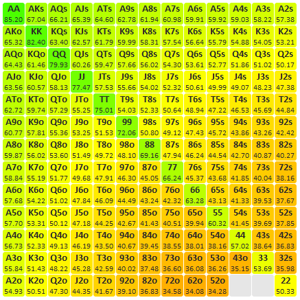 1. Начём с хиро. Допустим, мы считаем, что оппонент пушит с любыми двумя (что вполне резонно, учитывая прошлую историю и какой короткий у него стэк). Каким будет лучший ответ? Рейзит оппонент размером в банк. Как вы все прекрасно знаете, необходимое эквити для колла такой ставки - 33,3%. Только две руки не набирают столько - 42o и 32o. Получается, хиро должен коллировать практически со всем диапазоном (98,2%).