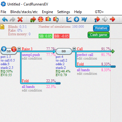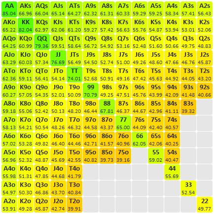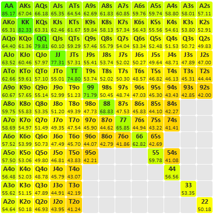 То есть лучшим ответом оппонента на стратегию хиро, который уравнивает с частотой в 98,2%, будет пуш с хендами, имеющими больше 41% эквити против спектра колла соперника. Этим условиям удовлетворяют 77,4% всех рук.