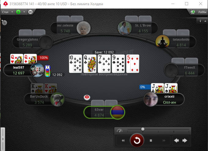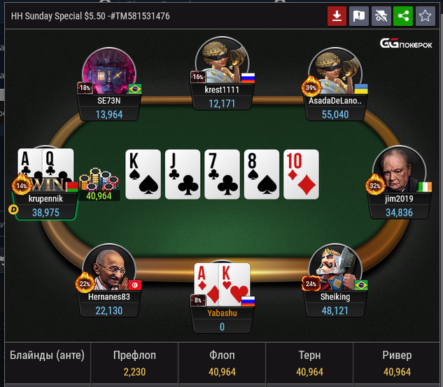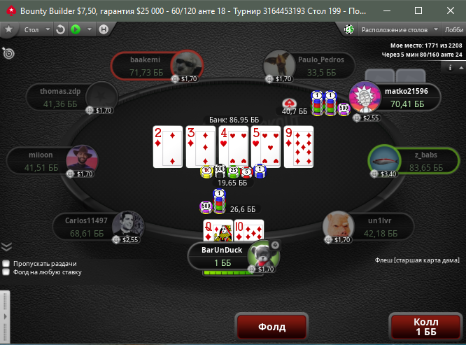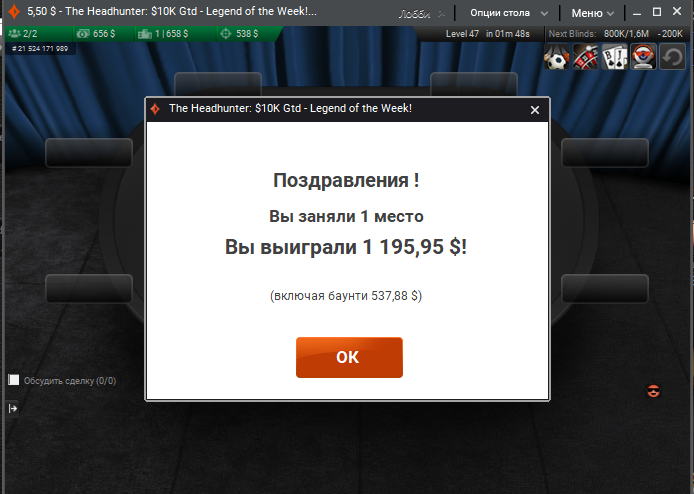 Поле было не сказать что сильное, игра была очень интересной, любители попадались, ну и такие же заливные как я, на них и утроился вначале, потом на бабле поехал мб в бб АВр в А9р 15 дип и поделили, сложилось и итмнулся