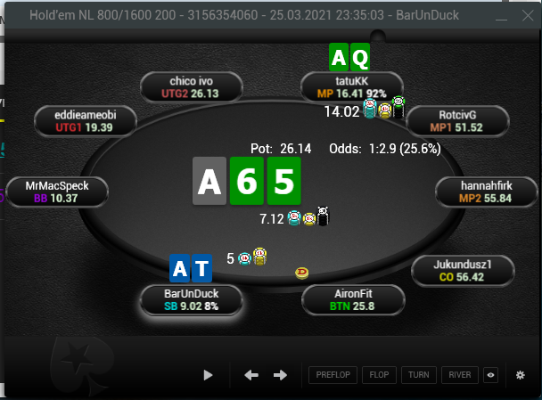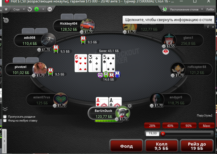 На пуш здесь всегда изи фолд если оппонент вменяемый, а он сидел и не вытикивался, но я решил посмотреть прав я или нет в своих догадках, сбалансированный колл я подумал и нажал, какой нах сбалансированный колл, кого я обманываю, надоело сидеть втыкать в один стол