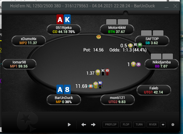 Единственный спорный вопрос, стандартный пуш для меня на этом столе, если черейз рейз играл то собрал бы много колов позади, на тайтовом столе или на более менее вменяемом рейз фолд отыгрываю обычно.