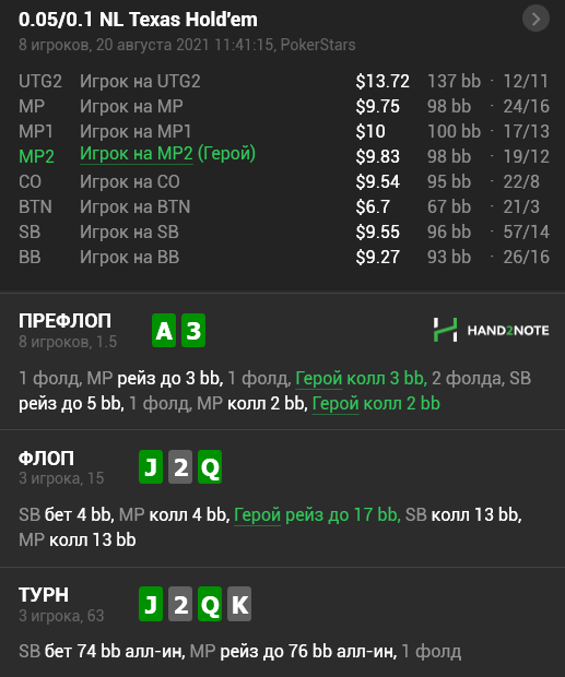 Но раз уж ты зачек-колил тёрн, то, возможно, колл его пуша на ривере был нормальной идеей - это был единственный способ окупить ловлю гатшота. Фулл-хаус там всё же будет не всегда, многие восьмёрки могли б сыграть так же, а вдобавок, там ещё есть J9 - 12 комбинаций умножить на какую-то частоту, с которой он ставил бы тёрн, а не чекал бы его бехайнд с этой рукой.