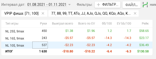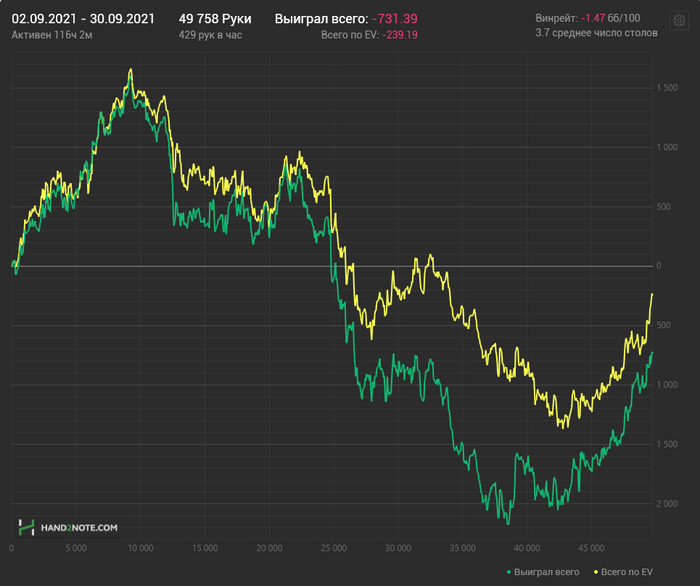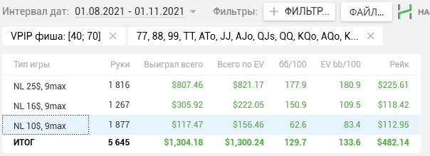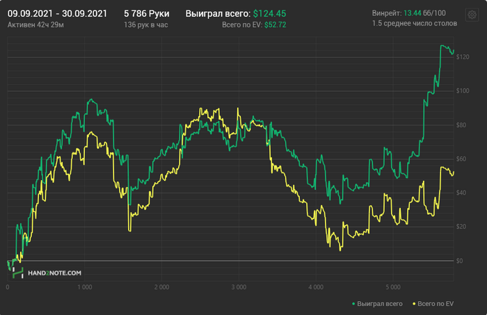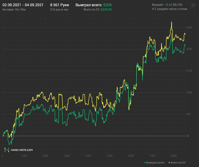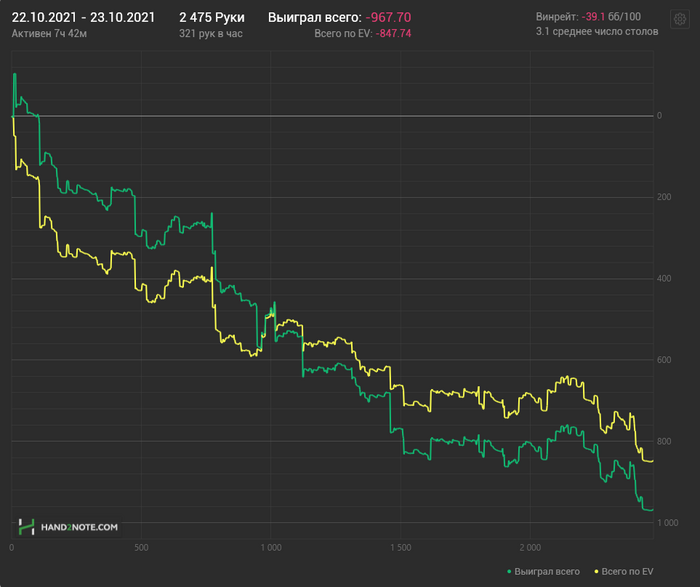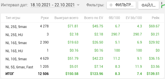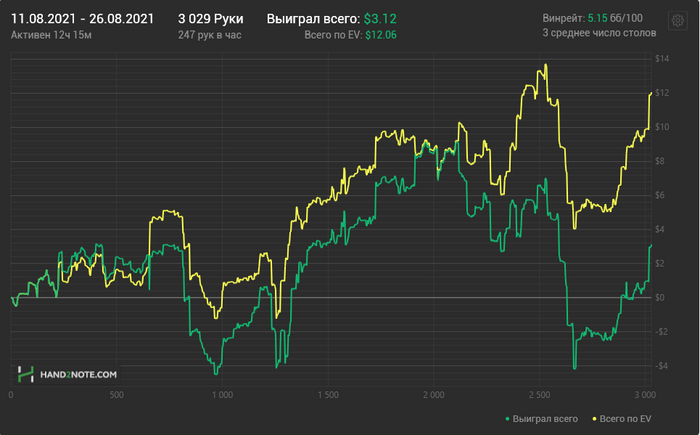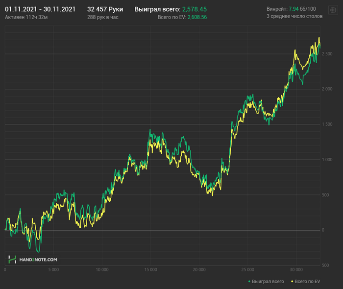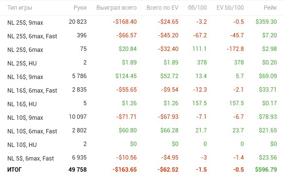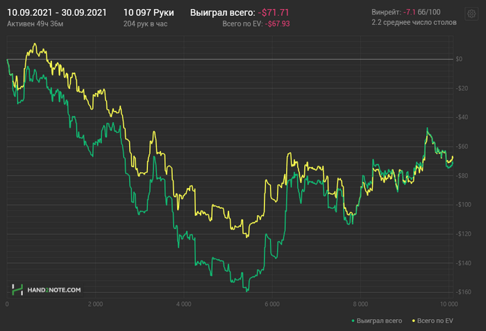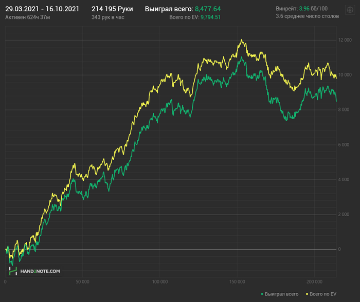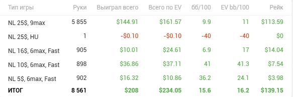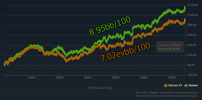 Причём по ощущениям НЛ25 прям хорошо давался, относительно качества решений. Хоть и в ноль там вся дистанция месилась (макс просадка и подъём по 3 стека), но считаю сейчас точно вверх пойдёт и свои 7бб/100 условных я там точно имею.