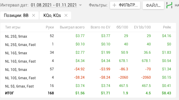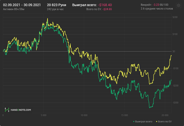 И знаете что? Если бы раньше мне сказали что то типо "дружище да ты может не туда катаешь, не ной на стрик и т.д., скинь базу посмотрим, покумекаем". Честно скажу, было бы стрёмно, и, наверное, я бы дал заднюю. Но после этого отыгранного месяца, я в своей игре уверен процентов на 99,9 (конечно же относительного поля 10-25, я понимаю, что чувак с сотки попустит за какие-нибудь лики). 0,01% - это условные 5-8 рук, за которые мне стыдно, либо специальные попытки "странных" линий в паре спотов. Но всё остальное считаю более, чем достойно. За месяц не вьёбан ни один стек по глупости!!!!