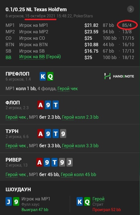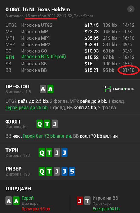Ну а если кратко, то миксовать 3 лимита в одну сессию - для меня очень плохо. Дело в том, что НЛ10 играл на похуй. Даже не так. Играл на похуй в абсолюте. Какие-то лишние колы ривера, проставление по 2 - 3 бареля не в мою доску, протягивание всякие фд/оесд против очевидных велью оппов. А на НЛ25, всё ещё хуже - давление денег. Очень много недоблефов, просто пздц как, аж стыдно было эти раздачи смотреть, оверфолд тёрна на крупные ставки вс топа моего диапа и прочая хрень, где я всегда зажимался лишь бы ББ в стеке сохранить.